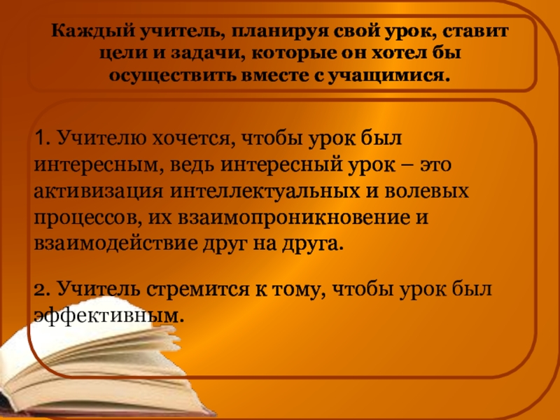 1. Учителю хочется, чтобы урок был интересным, ведь интересный урок – это активизация интеллектуальных и волевых процессов, их взаимопроникновение и взаимодействие друг на друга.