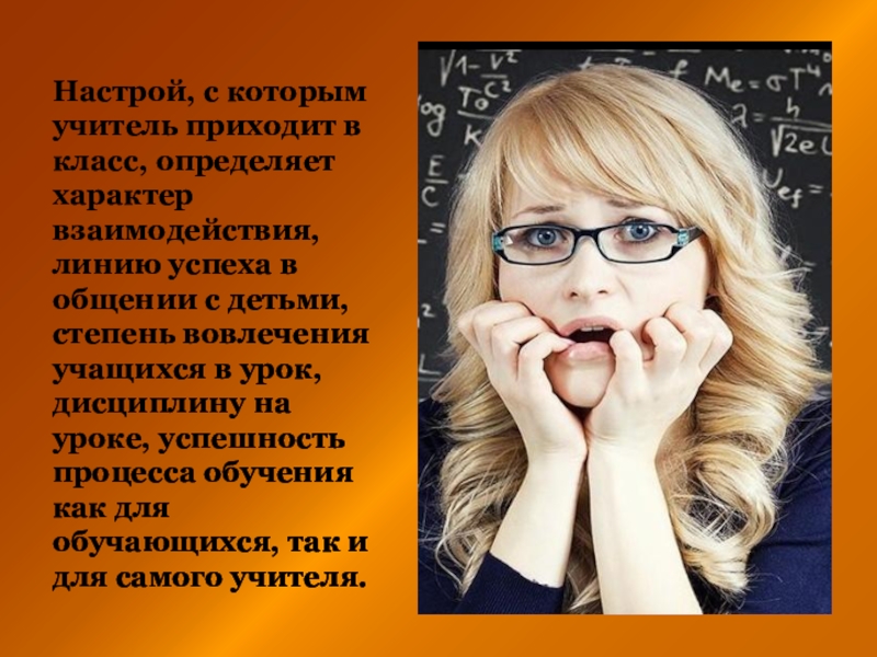 Слайд 12Настрой, с которым учитель приходит в класс, определяет характер взаимодействия, линию