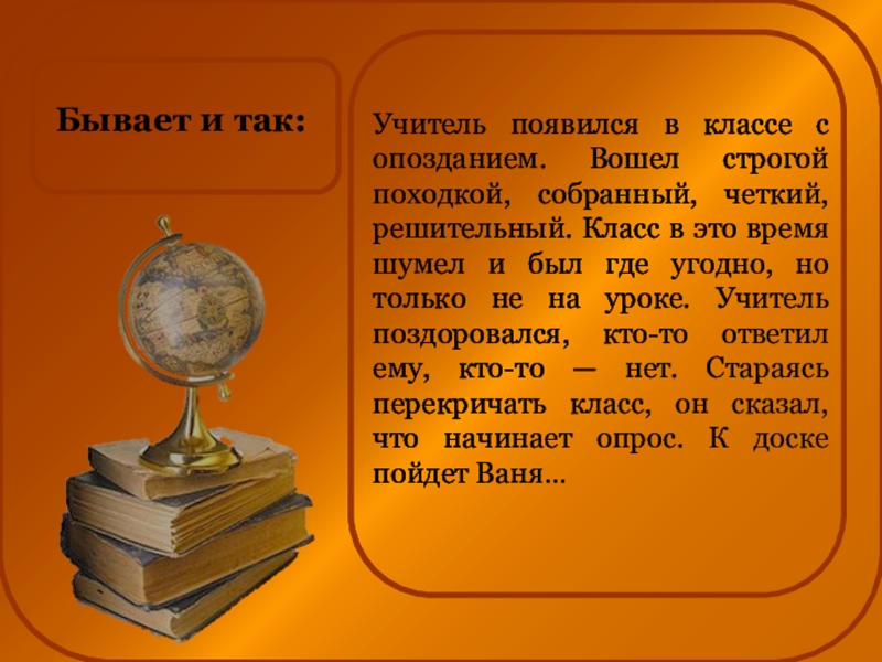 собранный, четкий, решительный. Класс в это время шумел и был где угодно, но только не на уроке. Учитель поздоровался, кто-то ответил ему, кто-то — нет. Стараясь перекричать класс, он сказал, что начинает опрос. К доске пойдет Ваня…