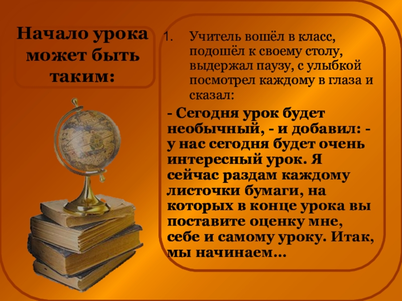 - Сегодня урок будет необычный, - и добавил: - у нас сегодня будет очень интересный урок. Я сейчас раздам каждому листочки бумаги, на которых в конце урока вы поставите оценку мне, себе и самому уроку. Итак, мы начинаем…