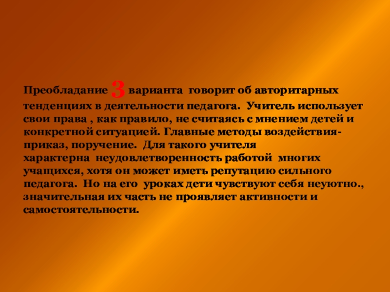 Слайд 20Преобладание 3 варианта говорит об авторитарных тенденциях в деятельности педагога. Учитель использует свои