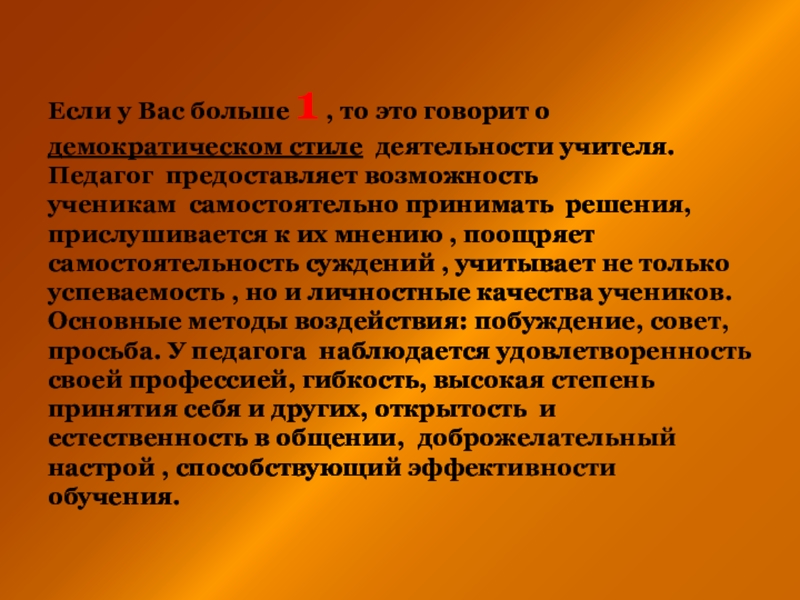 стиле деятельности учителя. Педагог предоставляет возможность ученикам самостоятельно принимать решения, прислушивается к их мнению , поощряет самостоятельность суждений , учитывает не только успеваемость , но и личностные качества учеников. Основные методы воздействия: побуждение, совет, просьба. У педагога наблюдается удовлетворенность своей профессией, гибкость, высокая степень принятия себя и других, открытость и естественность в общении, доброжелательный настрой , способствующий эффективности обучения.