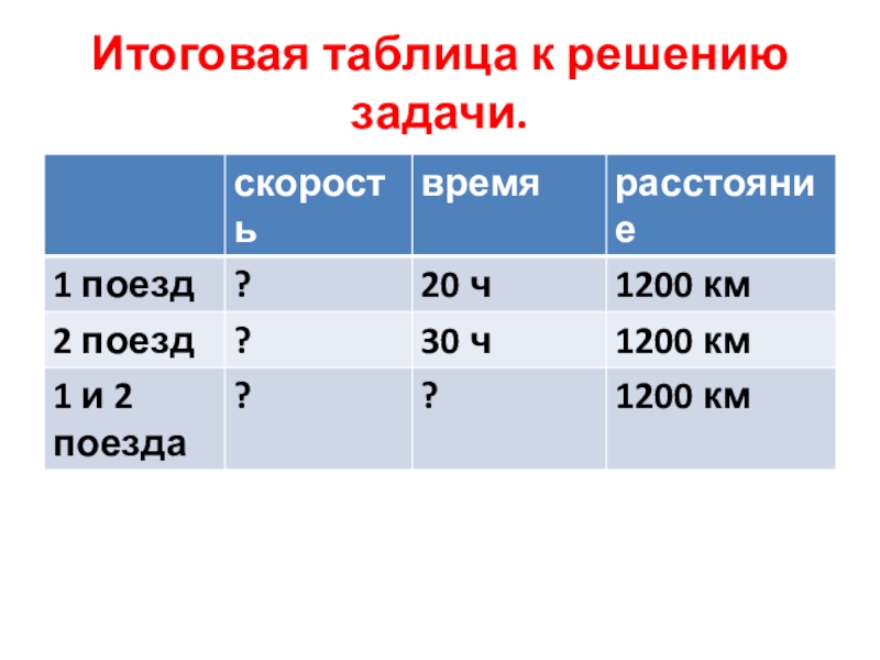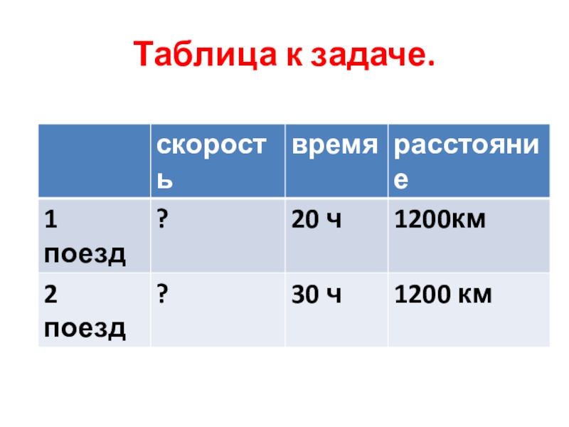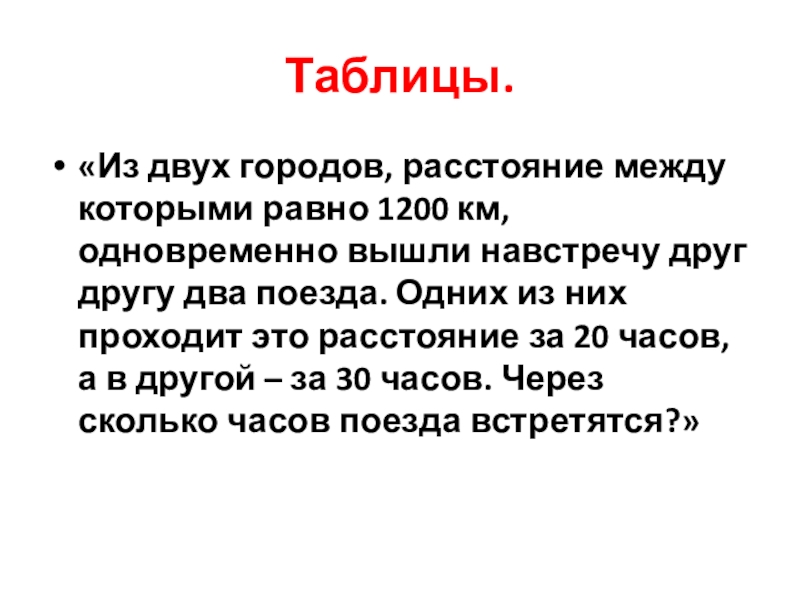 Таблицы.«Из двух городов, расстояние между которыми равно 1200 км, одновременно вышли навстречу друг другу два поезда. Одних