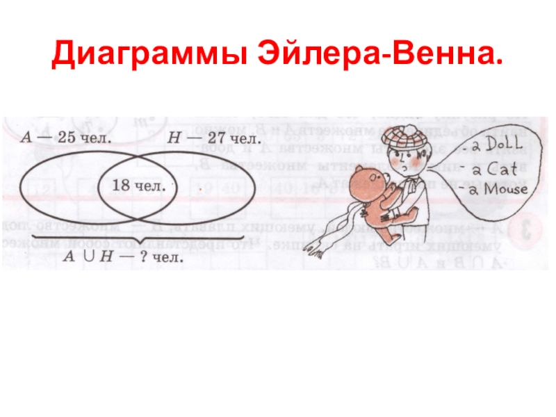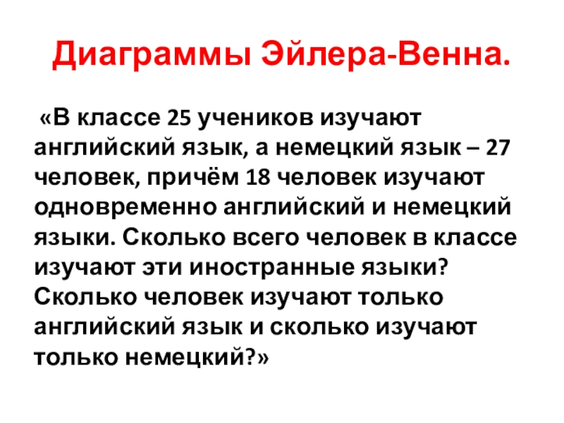 Диаграммы Эйлера-Венна. «В классе 25 учеников изучают английский язык, а немецкий язык – 27 человек, причём 18
