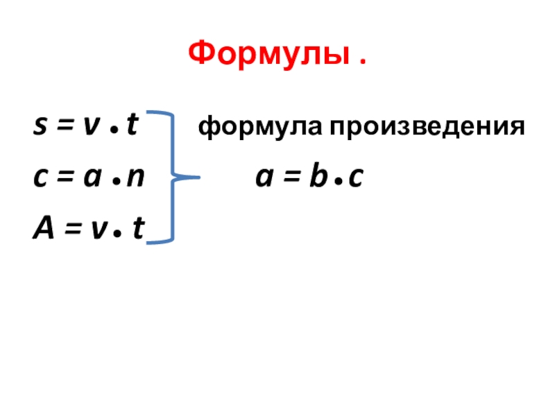 Формулы .s = v ● t    формула произведенияc = a ● n