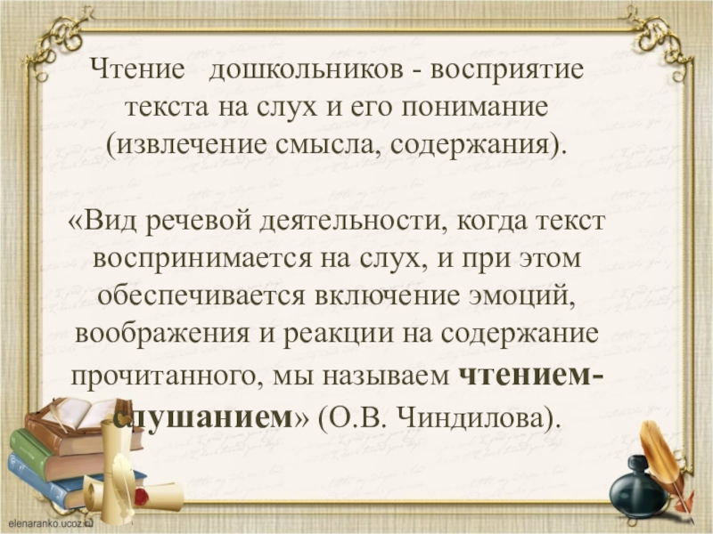 «Вид речевой деятельности, когда текст воспринимается на слух, и при этом обеспечивается включение эмоций, воображения и реакции на содержание прочитанного, мы называем чтением-слушанием» (О.В. Чиндилова).