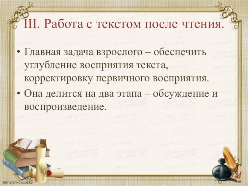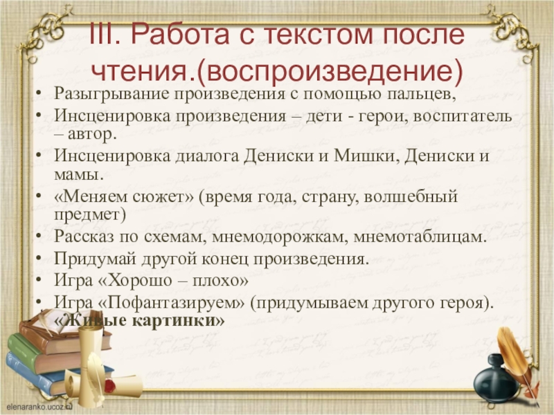 Слайд 23III. Работа с текстом после чтения.(воспроизведение)