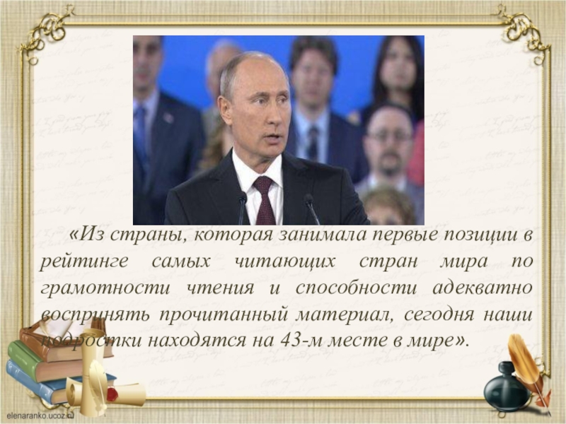 мира по грамотности чтения и способности адекватно воспринять прочитанный материал, сегодня наши подростки находятся на 43-м месте в мире».