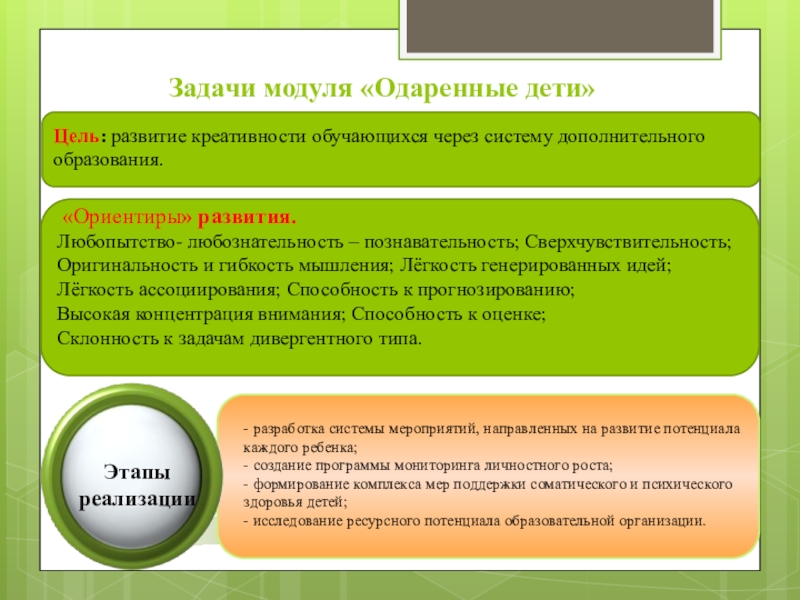 - разработка системы мероприятий, направленных на развитие потенциала каждого ребенка;