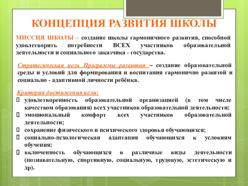 Стратегическая цель Программы развития – создание образовательной среды и условий для формирования и воспитания гармонично развитой и социально - адаптивной личности ребёнка.