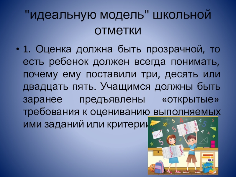 должен всегда понимать, почему ему поставили три, десять или двадцать пять. Учащимся должны быть заранее предъявлены «открытые» требования к оцениванию выполняемых ими заданий или критерии оценивания;