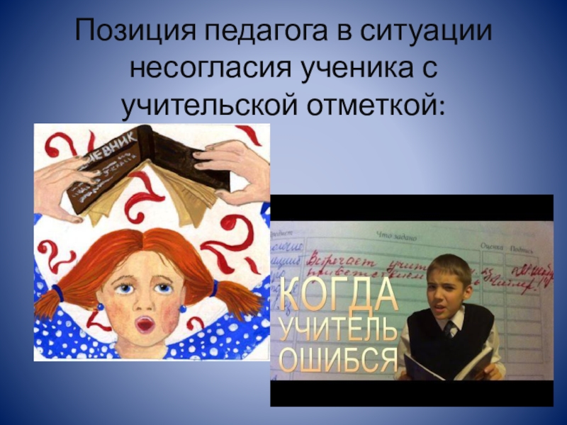 Слайд 1Позиция педагога в ситуации несогласия ученика с учительской отметкой: