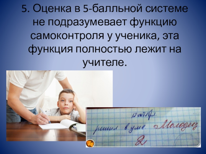 Слайд 115. Оценка в 5-балльной системе не подразумевает функцию самоконтроля у ученика,