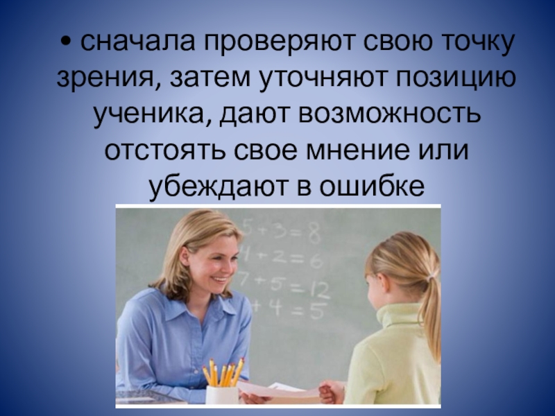 Слайд 5• сначала проверяют свою точку зрения, затем уточняют позицию ученика, дают