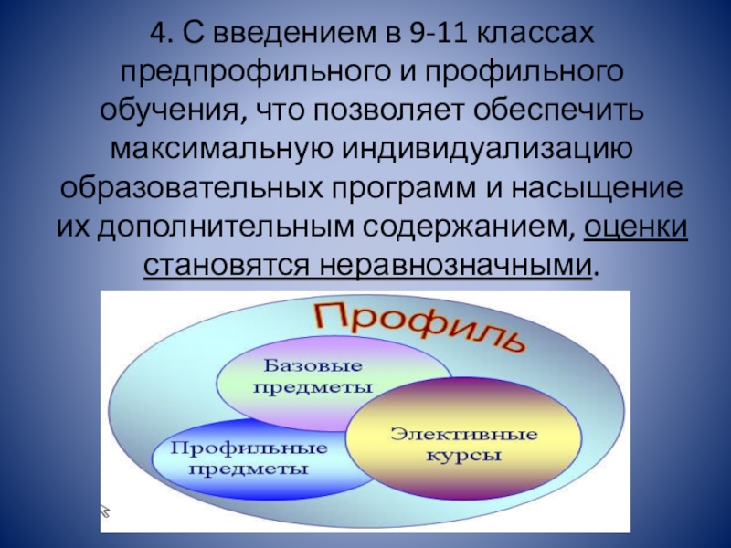 позволяет обеспечить максимальную индивидуализацию образовательных программ и насыщение их дополнительным содержанием, оценки становятся неравнозначными.