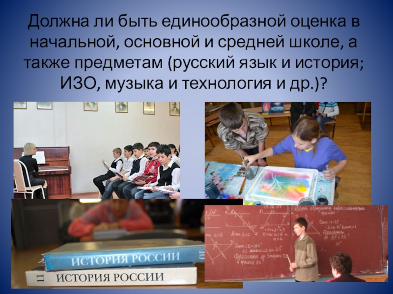 Слайд 27Должна ли быть единообразной оценка в начальной, основной и средней школе,