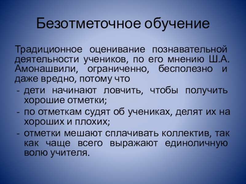 Традиционное оценивание познавательной деятельности учеников, по его мнению Ш.А.