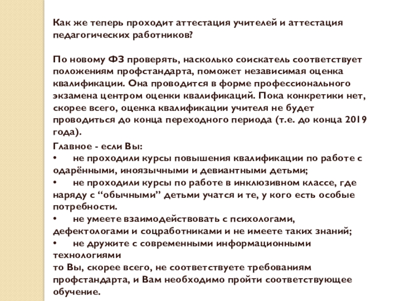 Также местные органы образования должны внести изменения в Положение об аттестации педагогических работников (в связи с вступлением в силу ФЗ «О независимой оценке квалификации» и необходимостью проводить аттестацию в соответствии с требованиями профстандартов).