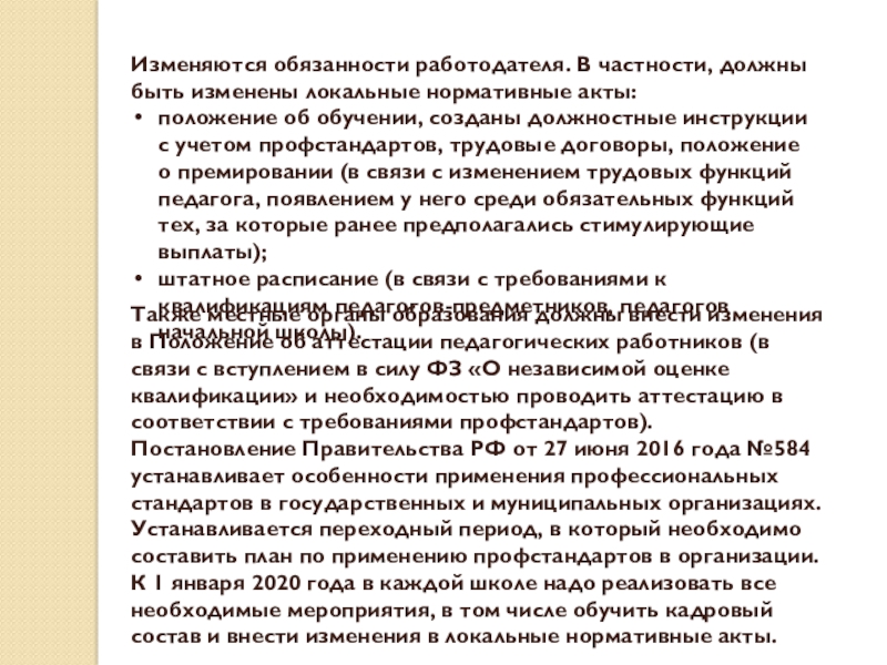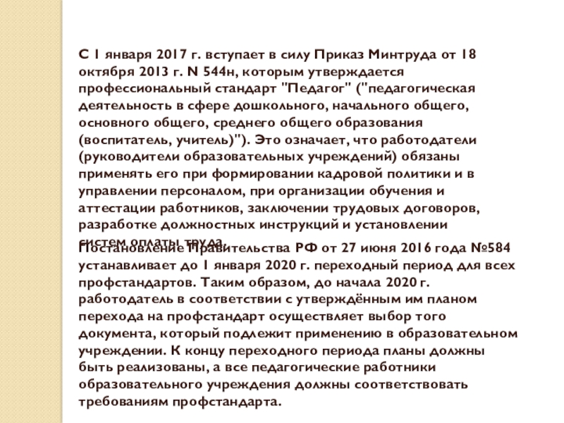 Постановление Правительства РФ от 27 июня 2016 года №584 устанавливает особенности применения профессиональных стандартов в государственных и муниципальных организациях. Устанавливается переходный период, в который необходимо составить план по применению профстандартов в организации. К 1 января 2020 года в каждой школе надо реализовать все необходимые мероприятия, в том числе обучить кадровый состав и внести изменения в локальные нормативные акты.