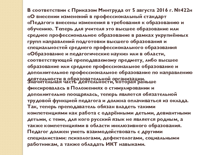 Значительная часть деятельности, которая раньше фиксировалась в Положениях о стимулировании и дополнительно поощрялась, теперь является обязательной трудовой функцией педагога и должна оплачиваться из оклада. Так, теперь преподаватель обязан владеть такими компетенциями как работа с одарёнными детьми, девиантными детьми, с теми, для кого русский язык не является родным, а также компетенциями в области инклюзивного образования. Педагог должен уметь взаимодействовать с другими специалистами: психологами, дефектологами, социальными работникам, а также обладать ИКТ навыками.
