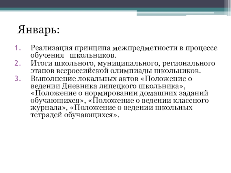 Январь:Реализация принципа межпредметности в процессе обучения  школьников.Итоги школьного, муниципального, регионального этапов всероссийской олимпиады школьников.Выполнение локальных актов