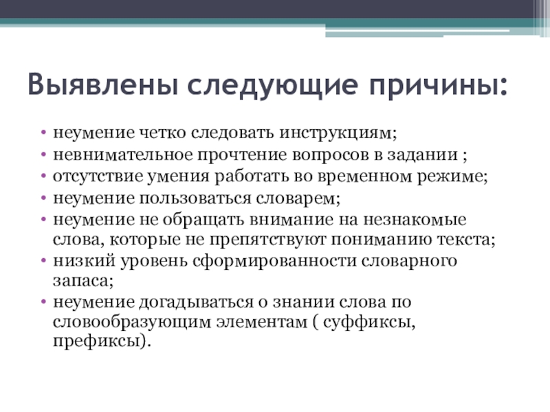 Выявлены следующие причины:неумение четко следовать инструкциям;невнимательное прочтение вопросов в задании ;отсутствие умения работать во временном режиме;неумение пользоваться
