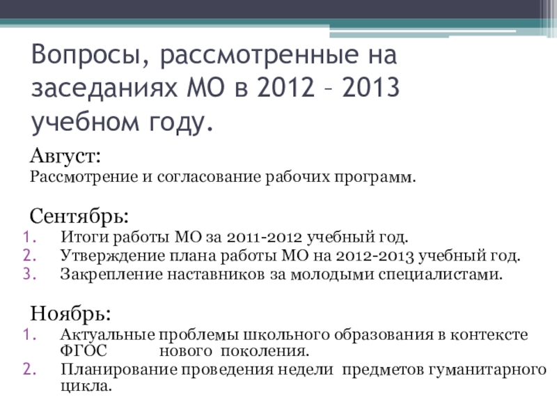 Слайд 9Вопросы, рассмотренные на заседаниях МО в 2012 – 2013 учебном году.