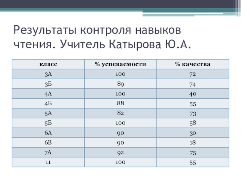 Слайд 3Результаты контроля навыков чтения. Учитель Катырова Ю.А.