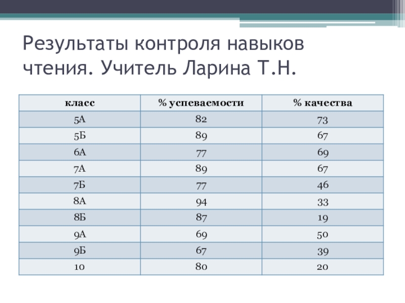 Слайд 2Результаты контроля навыков чтения. Учитель Ларина Т.Н.
