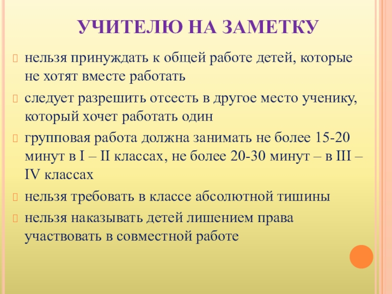 -и не следует ходить по классу или стоять около учеников в начале групповой работы: ученики часто стесняются высказываться в присутствии учителя.