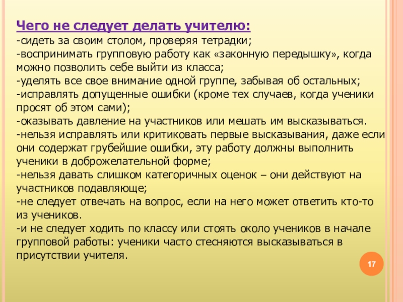 Слайд 17Чего не следует делать учителю: