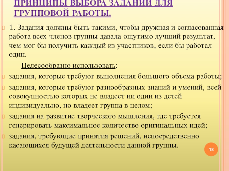 Слайд 18ПРИНЦИПЫ ВЫБОРА ЗАДАНИЙ ДЛЯ ГРУППОВОЙ РАБОТЫ.