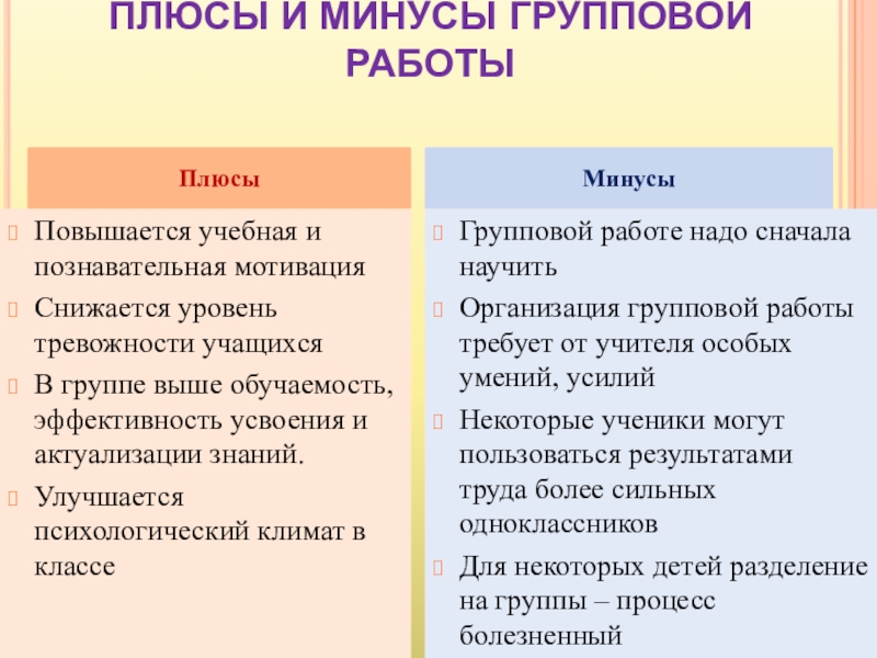 Слайд 10ПЛЮСЫ И МИНУСЫ ГРУППОВОЙ РАБОТЫ