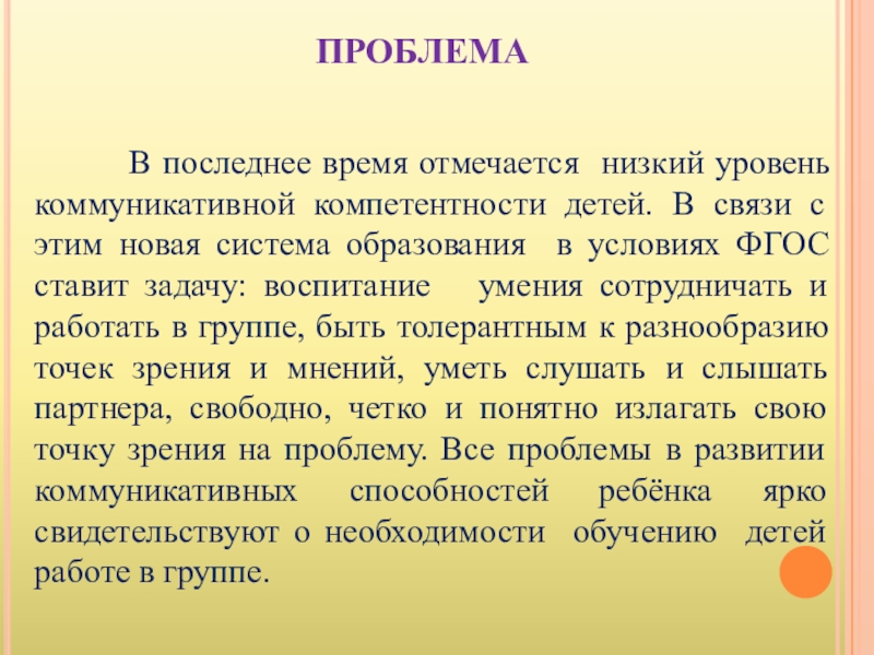 отмечается низкий уровень коммуникативной компетентности детей. В связи с этим новая система образования в условиях ФГОС ставит задачу: воспитание умения сотрудничать и работать в группе, быть толерантным к разнообразию точек зрения и мнений, уметь слушать и слышать партнера, свободно, четко и понятно излагать свою точку зрения на проблему. Все проблемы в развитии коммуникативных способностей ребёнка ярко свидетельствуют о необходимости обучению детей работе в группе.
