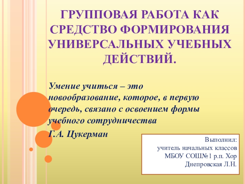 Слайд 1ГРУППОВАЯ РАБОТА КАК СРЕДСТВО ФОРМИРОВАНИЯ УНИВЕРСАЛЬНЫХ УЧЕБНЫХ ДЕЙСТВИЙ.