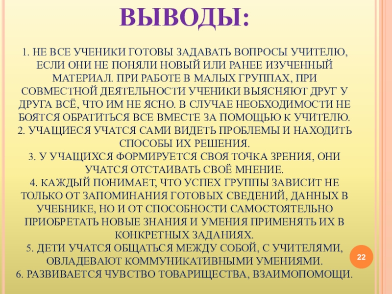 ПОНЯЛИ НОВЫЙ ИЛИ РАНЕЕ ИЗУЧЕННЫЙ МАТЕРИАЛ. ПРИ РАБОТЕ В МАЛЫХ ГРУППАХ, ПРИ СОВМЕСТНОЙ ДЕЯТЕЛЬНОСТИ УЧЕНИКИ ВЫЯСНЯЮТ ДРУГ У ДРУГА ВСЁ, ЧТО ИМ НЕ ЯСНО. В СЛУЧАЕ НЕОБХОДИМОСТИ НЕ БОЯТСЯ ОБРАТИТЬСЯ ВСЕ ВМЕСТЕ ЗА ПОМОЩЬЮ К УЧИТЕЛЮ.