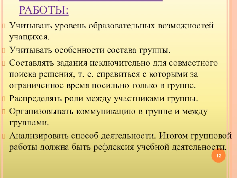 Слайд 12ПРИНЦИПЫ ГРУППОВОЙ РАБОТЫ: