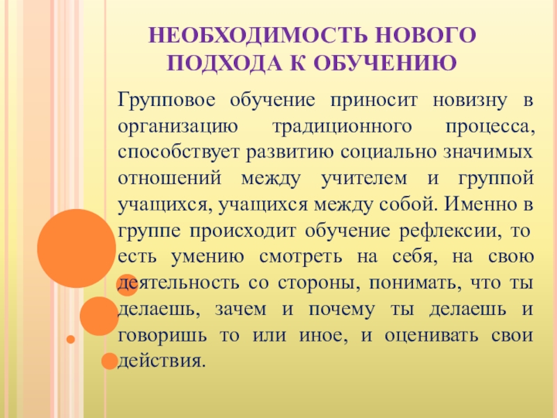 традиционного процесса, способствует развитию социально значимых отношений между учителем и группой учащихся, учащихся между собой. Именно в группе происходит обучение рефлексии, то есть умению смотреть на себя, на свою деятельность со стороны, понимать, что ты делаешь, зачем и почему ты делаешь и говоришь то или иное, и оценивать свои действия.