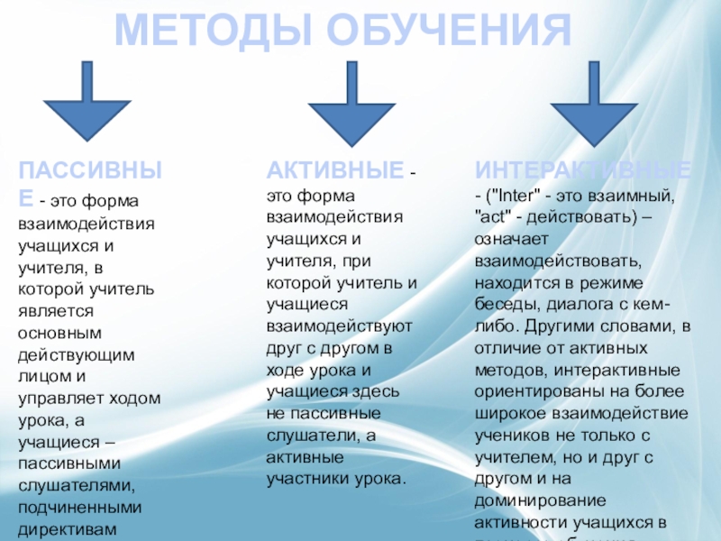 ИНТЕРАКТИВНЫЕ - ("Inter" - это взаимный, "act" - действовать) – означает взаимодействовать, находится в режиме беседы, диалога с кем-либо. Другими словами, в отличие от активных методов, интерактивные ориентированы на более широкое взаимодействие учеников не только с учителем, но и друг с другом и на доминирование активности учащихся в процессе обучения.