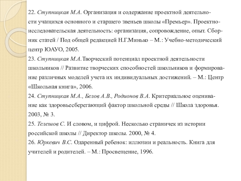 Слайд 1222. Ступницкая М.А. Организация и содержание проектной деятельно-
