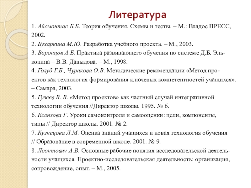 1. Айсмонтас Б.Б. Теория обучения. Схемы и тесты. – М.: Владос
