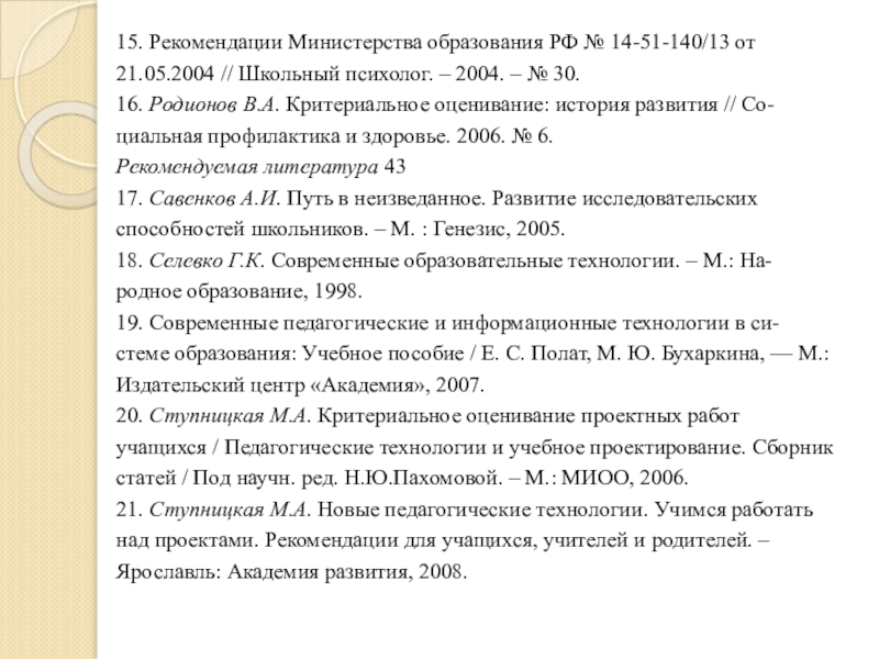 Слайд 1115. Рекомендации Министерства образования РФ № 14-51-140/13 от