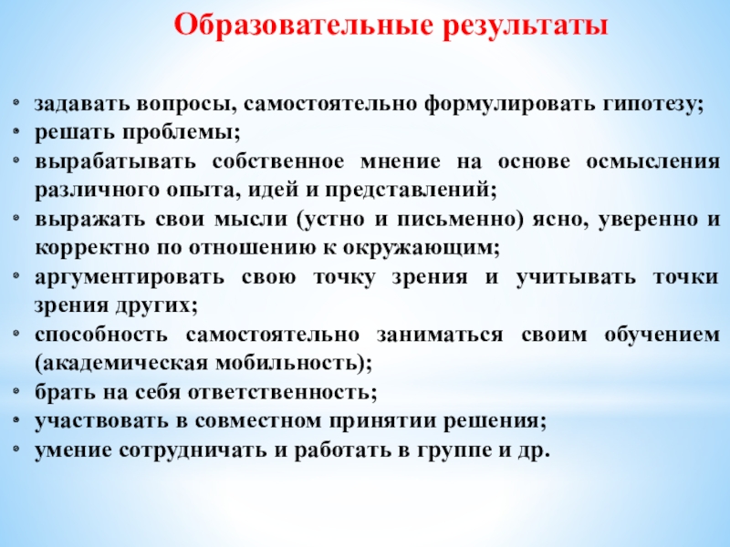 Развитие таких качеств личности, как критическое мышление, рефлексивность, коммуникативность, креативность, мобильность, самостоятельность, толерантность, ответственность за собственный выбор и результаты своей деятельности.