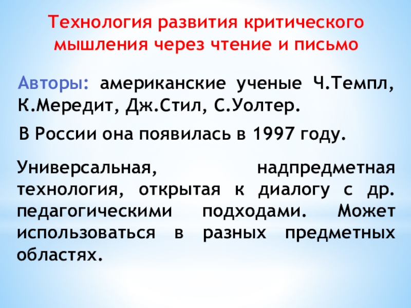 Универсальная, надпредметная технология, открытая к диалогу с др. педагогическими подходами. Может использоваться в разных предметных областях.