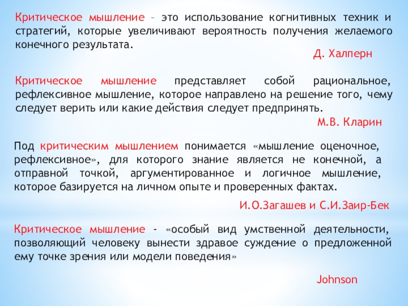 Под критическим мышлением понимается «мышление оценочное, рефлексивное», для которого знание является не конечной, а отправной точкой, аргументированное и логичное мышление, которое базируется на личном опыте и проверенных фактах.
