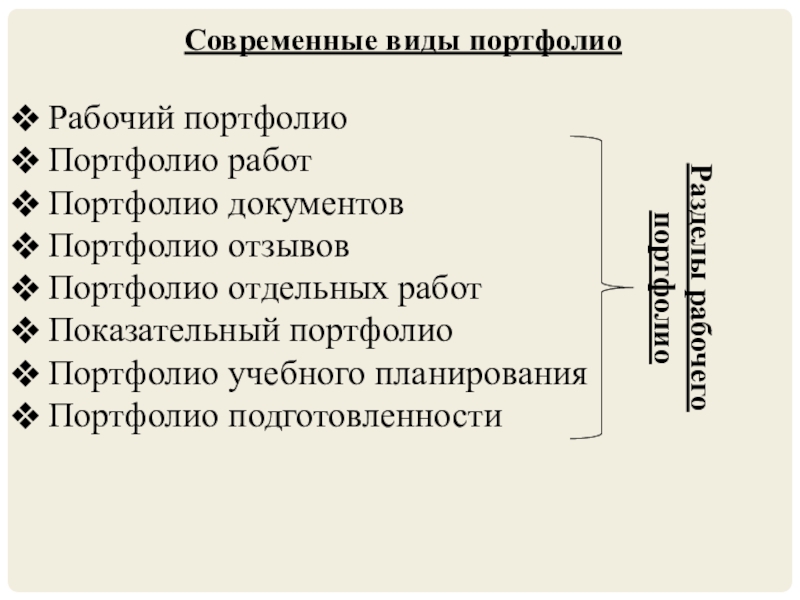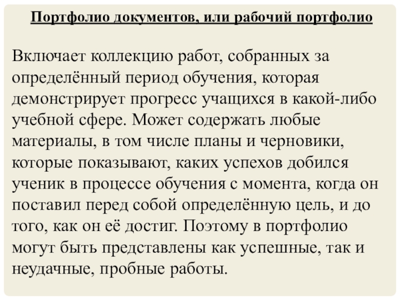 обучения, которая демонстрирует прогресс учащихся в какой-либо учебной сфере. Может содержать любые материалы, в том числе планы и черновики, которые показывают, каких успехов добился ученик в процессе обучения с момента, когда он поставил перед собой определённую цель, и до того, как он её достиг. Поэтому в портфолио могут быть представлены как успешные, так и неудачные, пробные работы.