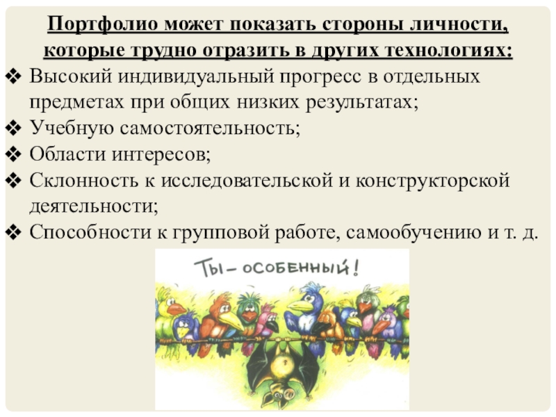 Слайд 4Портфолио может показать стороны личности, которые трудно отразить в других технологиях: