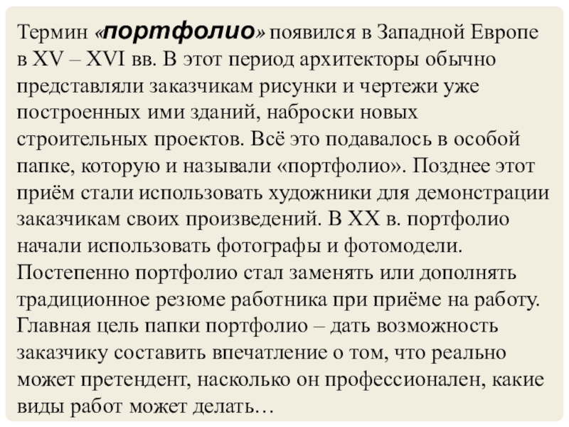 В этот период архитекторы обычно представляли заказчикам рисунки и чертежи уже построенных ими зданий, наброски новых строительных проектов. Всё это подавалось в особой папке, которую и называли «портфолио». Позднее этот приём стали использовать художники для демонстрации заказчикам своих произведений. В ХХ в. портфолио начали использовать фотографы и фотомодели. Постепенно портфолио стал заменять или дополнять традиционное резюме работника при приёме на работу. Главная цель папки портфолио – дать возможность заказчику составить впечатление о том, что реально может претендент, насколько он профессионален, какие виды работ может делать…