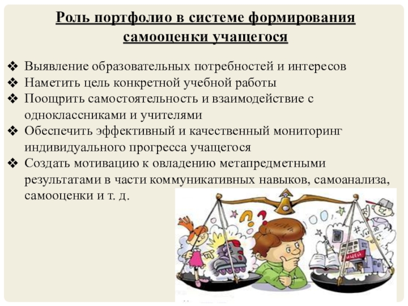 Слайд 16Роль портфолио в системе формирования самооценки учащегося