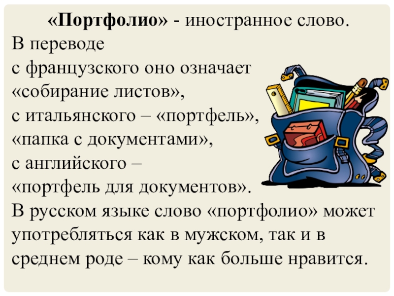 В русском языке слово «портфолио» может употребляться как в мужском, так и в среднем роде – кому как больше нравится.